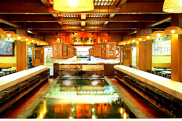 For a visual and culinary spectacle, Chikae is unmatched. Upon entering, guests are greeted by massive fish tanks running through the center of the restaurant, filled with swimming squid, sea bream, and lobster.
